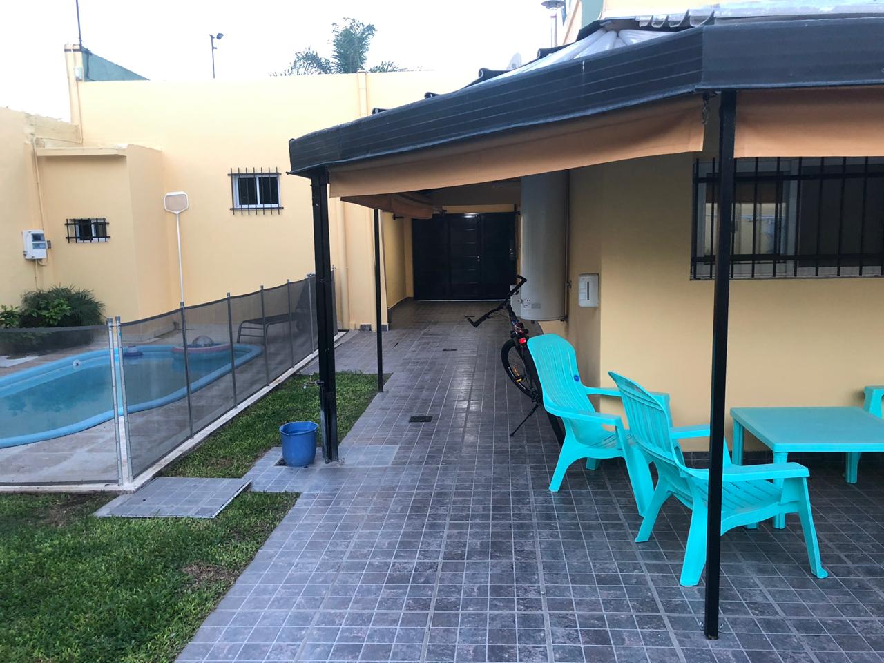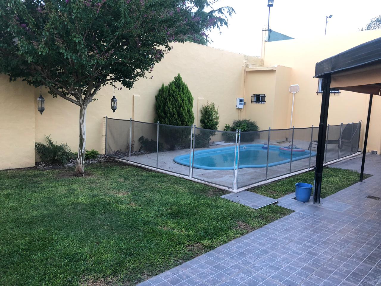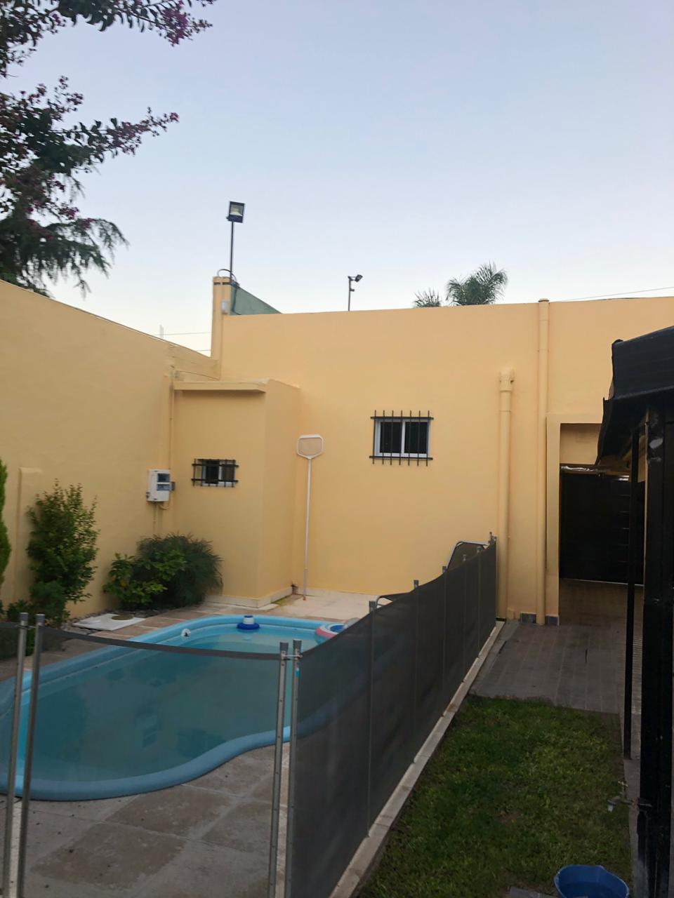 2 dormitorios c/ placard, living, coc/com, 2 baños, e/ de auto y garage, patio c/ piscina y lav. Cubierto.